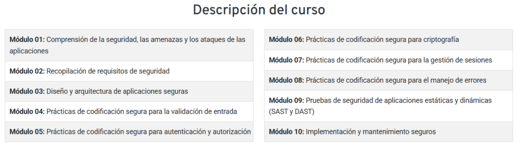 Está diseñado como un curso práctico e integral de seguridad en aplicaciones que ayudará a los profesionales del software a crear aplicaciones seguras.